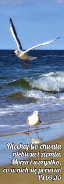 Zakładka laminowana, wielkość ok. 5x14 cm, motyw ptaki, werset z Ps 69,35.