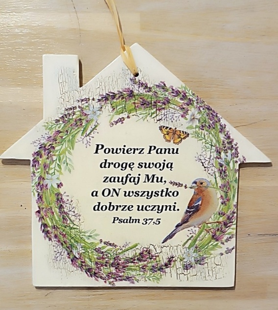 Domek drewniany do powieszenia, motyw lawenda, werset z Psalmu 37,5.