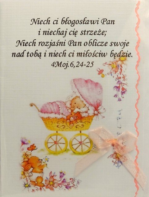 Rozmiar standard, motyw: dzidziuś w różowym wózku, werset: Niech ci błogosławi Pan i niechaj cię strzeże; niech rozjaśni Pan oblicze swoje nad tobą i niech ci miłościw będzie. 4 Moj. 6,24-25
