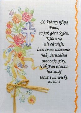Rozmiar standard, motyw: krzyż i kwiaty, werset: Ci, którzy ufają Panu, są jak góra Syjon, która się nie chwieje, lecz trwa wiecznie. Jak Jeruzalem otaczają góry, tak Pan otacza lud swój teraz i na wieki. Ps. 125,1-2