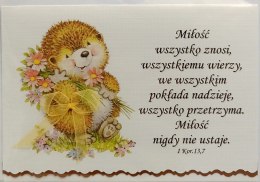 Rozmiar standard, motyw: jeżyk, werset: Miłość wszystko znosi, wszystkiemu wierzy, we wszystkim pokłada nadzieję, wszystko przetrzyma. Miłość nigdy nie ustaje. 1 Kor. 13,7